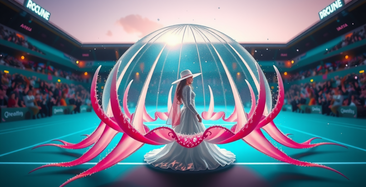 Kwal-kostuums & kristaljurken: Naomi Osaka steelt opnieuw de show Voor de loting ook maar één bal rolde had Naomi Osaka al alle flitsen op zich gericht. De Amerikaans-Japanse komt Melbourne binnen met een fladderend, glimmend visueel statement: Witte hoed, sluier en – wacht eens – een paraplu als japon. Modehuis Robert Wun tekende voor dit